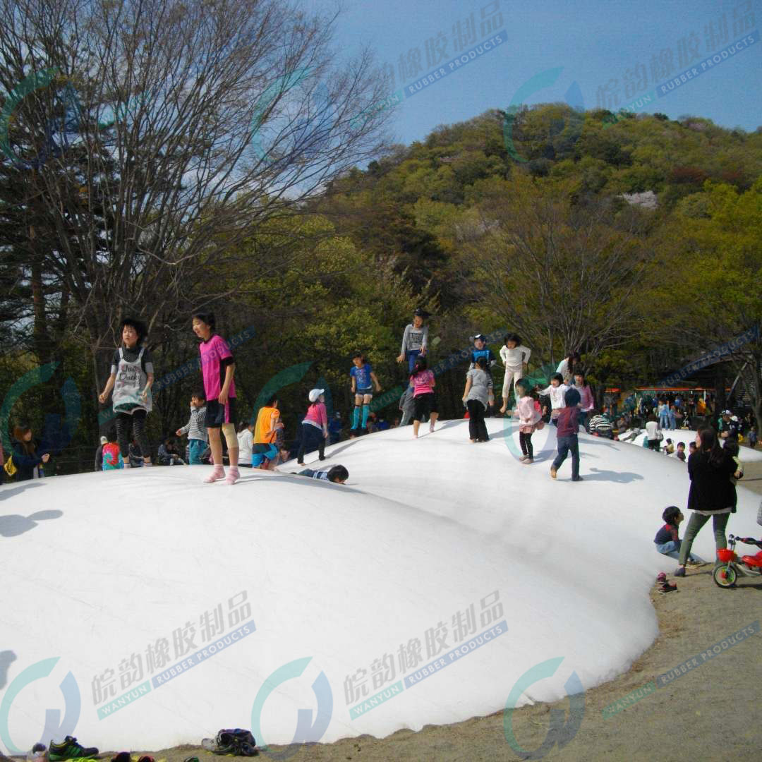 蹦蹦云和充氣城堡一樣,也是由pvc材料加工成的游樂設施,風機充氣后小孩就能在上邊蹦蹦跳跳。不同的是充氣城堡是用針線縫紉,不是全密封結構,而蹦蹦云是全密封結構,只需一次充氣,就能保證長期使用。還有一點跟充氣城堡最大的區別就是蹦蹦云有一部分是埋在地下的,并且高度一般不超過兩米,所以蹦蹦云的抗風能力更強,一般的風力是對蹦蹦云沒有影響的。蹦蹦云比起充氣城堡更柔軟,彈性空間更大,踩上去軟綿綿的,就像是踩棉花,兒童不用擔心會摔疼。
