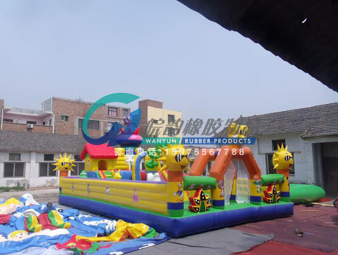 充氣城堡采用專 業(yè)的原材料供應(yīng)商,0.45mm一等加厚,環(huán)保型PVC材料。專業(yè)的設(shè)計(jì)人員生產(chǎn)工藝:下料,縫紉(熱合),粘整(美化),成品。盡可能多的使用雙明線縫 制,線跡均勻,針距控制在4.2到4.5mm之間。(能夠最大限度的減少漏氣和增加縫紉部位的垃圾強(qiáng)度。)粘整刷膠寬度與粘條的寬度誤差不超過(guò)正負(fù) 0.5cm。造型與大面連接處最大限度地采用弧線結(jié)構(gòu)。目的是使產(chǎn)品的受力均勻,增加產(chǎn)品的使用壽命。每?jī)蓚(gè)造型之間和造型與護(hù)欄之間都有一定的安全距 離。(1米)產(chǎn)品造型逼真,顏色搭配美觀。而且能夠充分保證游玩者的安全。