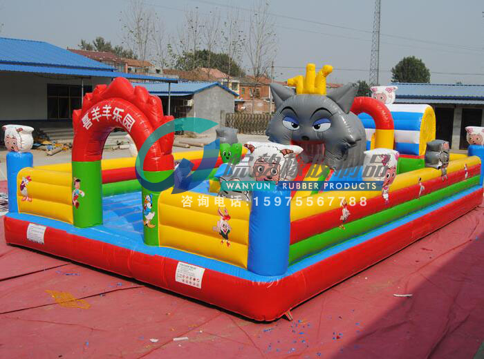 充氣城堡采用專 業的原材料供應商,0.45mm一等加厚,環保型PVC材料。專業的設計人員生產工藝:下料,縫紉(熱合),粘整(美化),成品。盡可能多的使用雙明線縫 制,線跡均勻,針距控制在4.2到4.5mm之間。(能夠最大限度的減少漏氣和增加縫紉部位的垃圾強度。)粘整刷膠寬度與粘條的寬度誤差不超過正負 0.5cm。造型與大面連接處最大限度地采用弧線結構。目的是使產品的受力均勻,增加產品的使用壽命。每兩個造型之間和造型與護欄之間都有一定的安全距 離。(1米)產品造型逼真,顏色搭配美觀。而且能夠充分保證游玩者的安全。